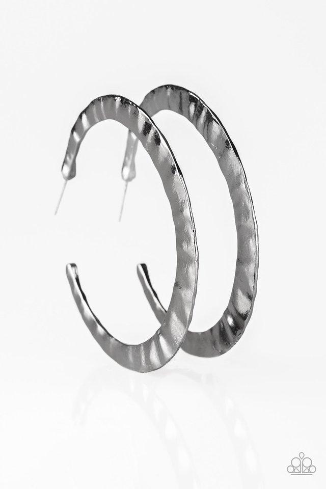Enhance your style with the Paparazzi Earrings Slayers Gonna Slay in striking black. A hammered gunmetal hoop with a high-sheen finish adds fierceness to any outfit. These hoop earrings measure 2 1/2" in diameter and attach with a standard post fitting. Sold as one pair of hoop earrings.