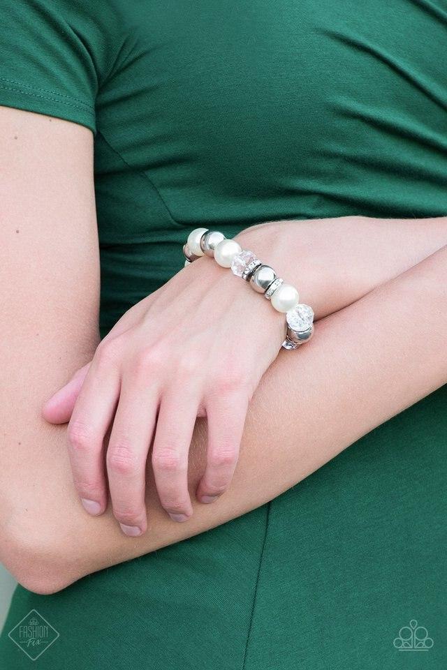 Oversized silver, crystal-like, and pearly white beads are threaded along a stretchy elastic band and wrapped around the wrist for a glamorous look. White rhinestone encrusted rings are sprinkled between the dramatic beads for a sparkling finish.