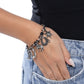 A collection of black marbled stone hearts is paired with a series of silver western-inspired charms, including a cowboy boot, horseshoe, a saddled horse, a stirrup, and a detailed sheriff badge. Features an adjustable clasp closure. As the stone elements in this piece are natural, some color variation is normal.