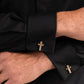Featuring a thick border, a faceted gold cross glistens for a dynamic divine-inspired cuff link.
