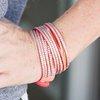 Orange suede is spliced into six strands and embellished with rows of white rhinestones for a glitzy combination. The elongated suede band allows for a trendy double wrap design. Features an adjustable snap closure.