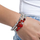 Infused along elastic stretchy bands, a collection of silver round, disc, and cubed beads, faceted red beads with an iridescent overlay, abstract red-swirled acrylics, red faceted beads, sparkly red glass hearts, red oil spill abstract beads, white and pink-painted rose beads, red milky discs, white pearls, and white rhinestone-dotted silver flowers stack atop the wrist in a powerful pattern for a whimsical display.