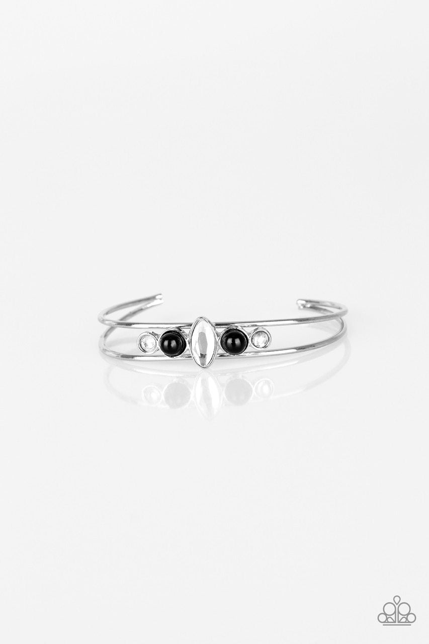 Enhance your outfit with the Paparazzi Bracelet ~ Guest Of A Guest - Black. Featuring glittery white rhinestones and shiny black beads on a silver cuff, this bracelet offers a refined look. Sold individually, this piece is a must-have for any jewelry collection. Check out our bracelets collection for more stunning options.