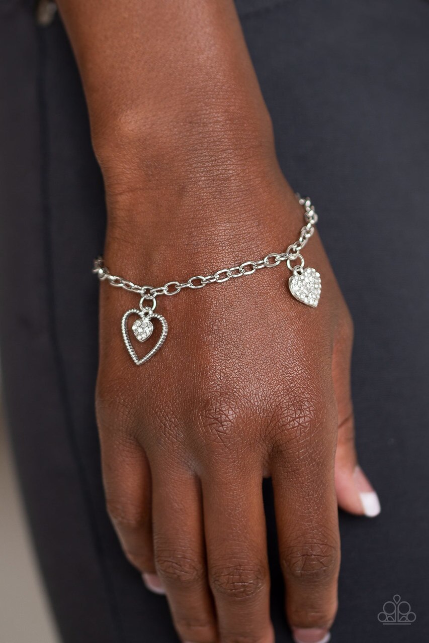 Shop this stunning Paparazzi Bracelet featuring silver hearts and rhinestone encrusted heart frames. The adjustable clasp closure makes it perfect for any wrist size. Sold individually, this charming piece adds a touch of elegance to any outfit. Explore more Paparazzi Bracelets in our collection of affordable jewelry.