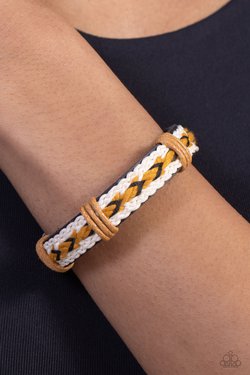 Knotted in place with brown cording, gold, black, and white cording decoratively weaves across the front of a black leather band for an adventurous pop of color around the wrist. Features an adjustable sliding knot closure.