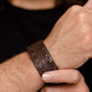 Featuring an airy circular cutout pattern, pieces of rustic brown leather are studded and stitched together for a rugged look around the wrist. Features an adjustable snap closure.