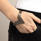 Rows of dainty white rhinestones and brass studs line the edges of a layered, daring V-shaped brass cuff for a rustically regal look.