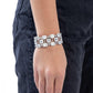 Dotted with silver studs and hematite rhinestones, alternating rows of silver squares stagger across the wrist beside hammered silver bars and silver beads for a gritty-glamorous statement atop the wrist along elastic stretchy bands.