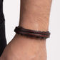 A pair of dainty brown leather bands joins a braided strand of brown leather cording around the wrist, resulting in rustic layers. Features an adjustable sliding knot closure.