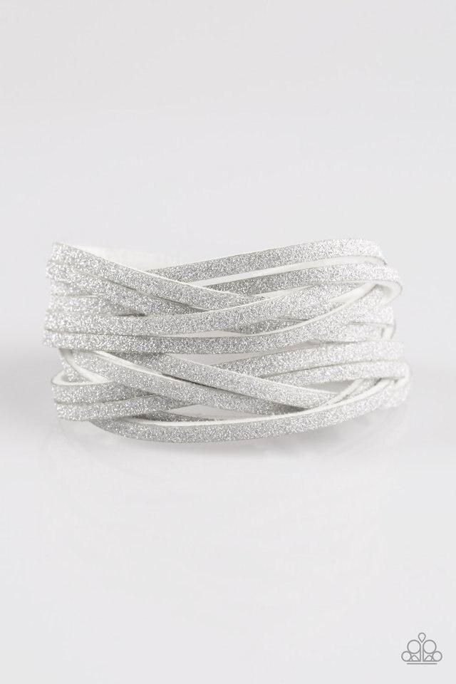 Enhance your style with this stunning Paparazzi Bracelet in Shameless Shimmer White. Dusted in silvery shimmer, the white suede strands crisscross elegantly creating a glittery fashion statement. The adjustable snap closure offers a perfect fit. Sold individually. Type: Bracelets. Explore more jewelry options at Paparazzi Jewelry Bracelets.