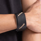 Sections of twine are stitched across a piece of black leather that is studded in place across the front of a thick black leather band, resulting in a rustic centerpiece around the wrist. Features an adjustable snap closure.