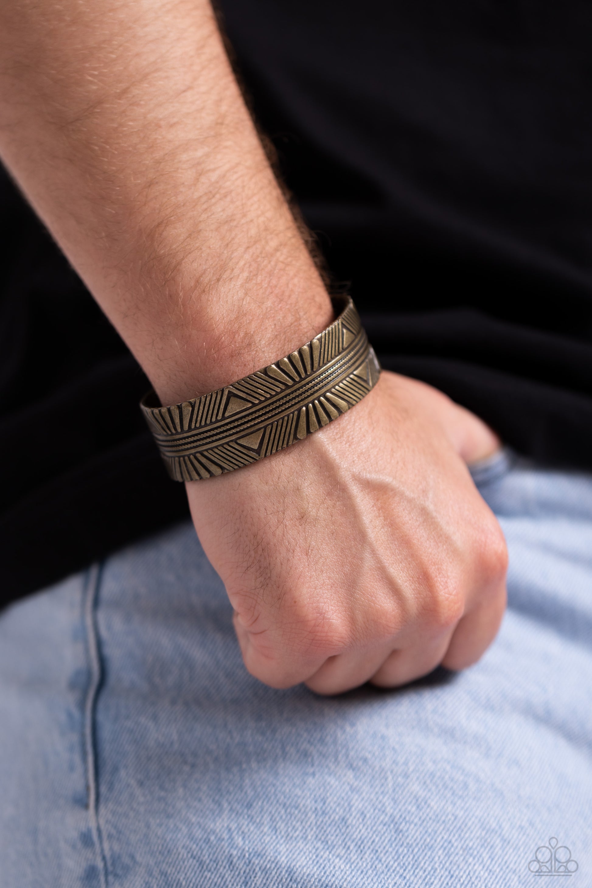 Separated by center rows of smooth and textured lines, antiqued geometric patterns repeat across the front of a brass cuff for an adventurous vibe.