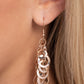 A cluster of flat rose gold rings in graduating sizes are linked along a rose gold chain creating an intensely industrial chandelier. Earring attaches to a standard fishhook fitting.