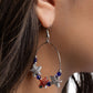 The bottom of a dainty silver wire hoop is infused with silver beads, faceted blue beads, and a trio of stars dusted in white and red rhinestones, resulting in a polished, patriotic look. Earring attaches to a standard fishhook fitting.