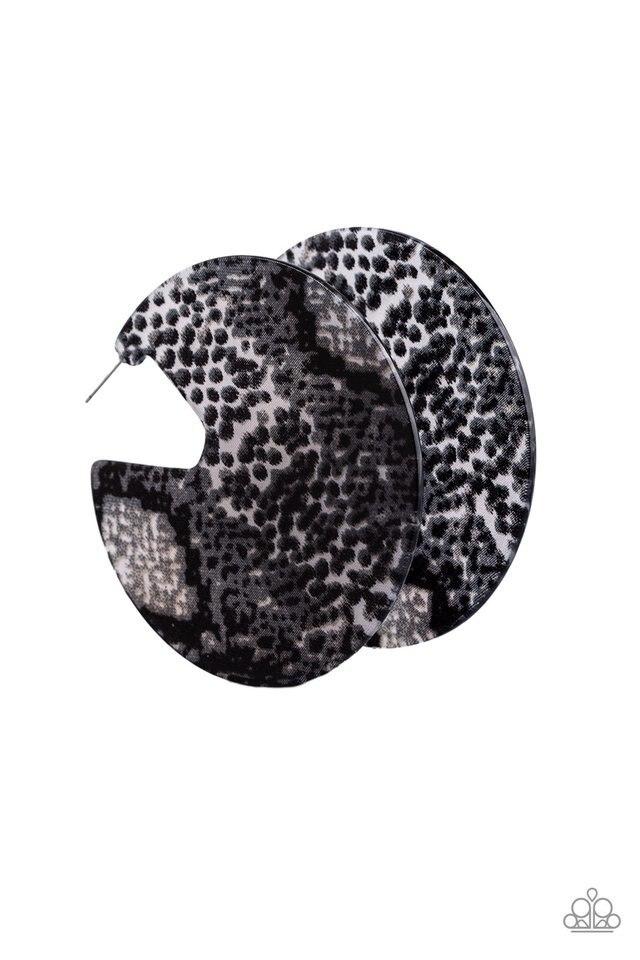 Experience a retro style with the Paparazzi Earring Hit Or HISS in black. Featuring a python pattern, these abstract acrylic hoop earrings curl around the ear, making a bold statement. The earrings attach to a standard post fitting and measure approximately 2 3/4" in diameter. Sold as one pair, these earrings are a must-have addition to your collection.