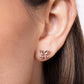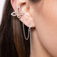 A three-dimensional airy, white rhinestone-encrusted and orange gem teardrop silver butterfly gently curves and flutters atop the ear on a silver cuff, creating a stunning statement. A solitaire silver butterfly encrusted in dainty white rhinestones is attached to a dainty silver chain that extends below the whimsical cuff, attaching to thin silver threading cap fittings for the ability to weave along the ear across multiple piercings for an adorably aerial look.