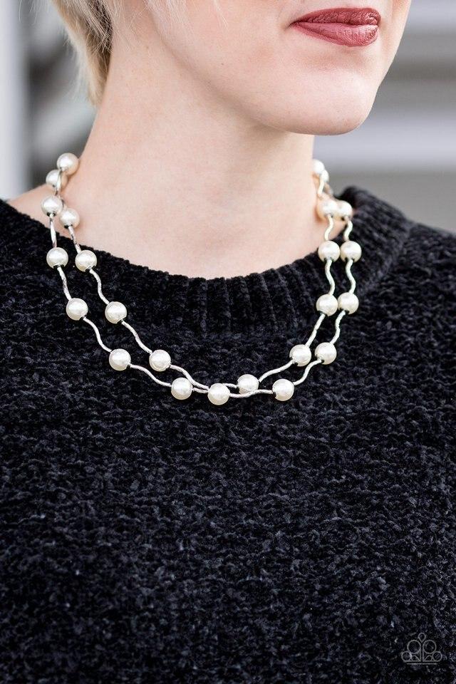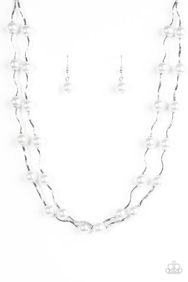 Layers of wavy silver beading join classic white pearls below the collar, adding a refined twist to the timeless pearl palette for an elegant look. Features an adjustable clasp closure. Sold as one individual necklace. Includes one pair of matching earrings. Embrace sophistication with this stunning Paparazzi Necklace - Ahead Of The FAME - White from Debs Jewelry Shop's Necklaces collection. Explore more Paparazzi jewelry necklaces here: Debs Jewelry Shop Paparazzi Necklaces.