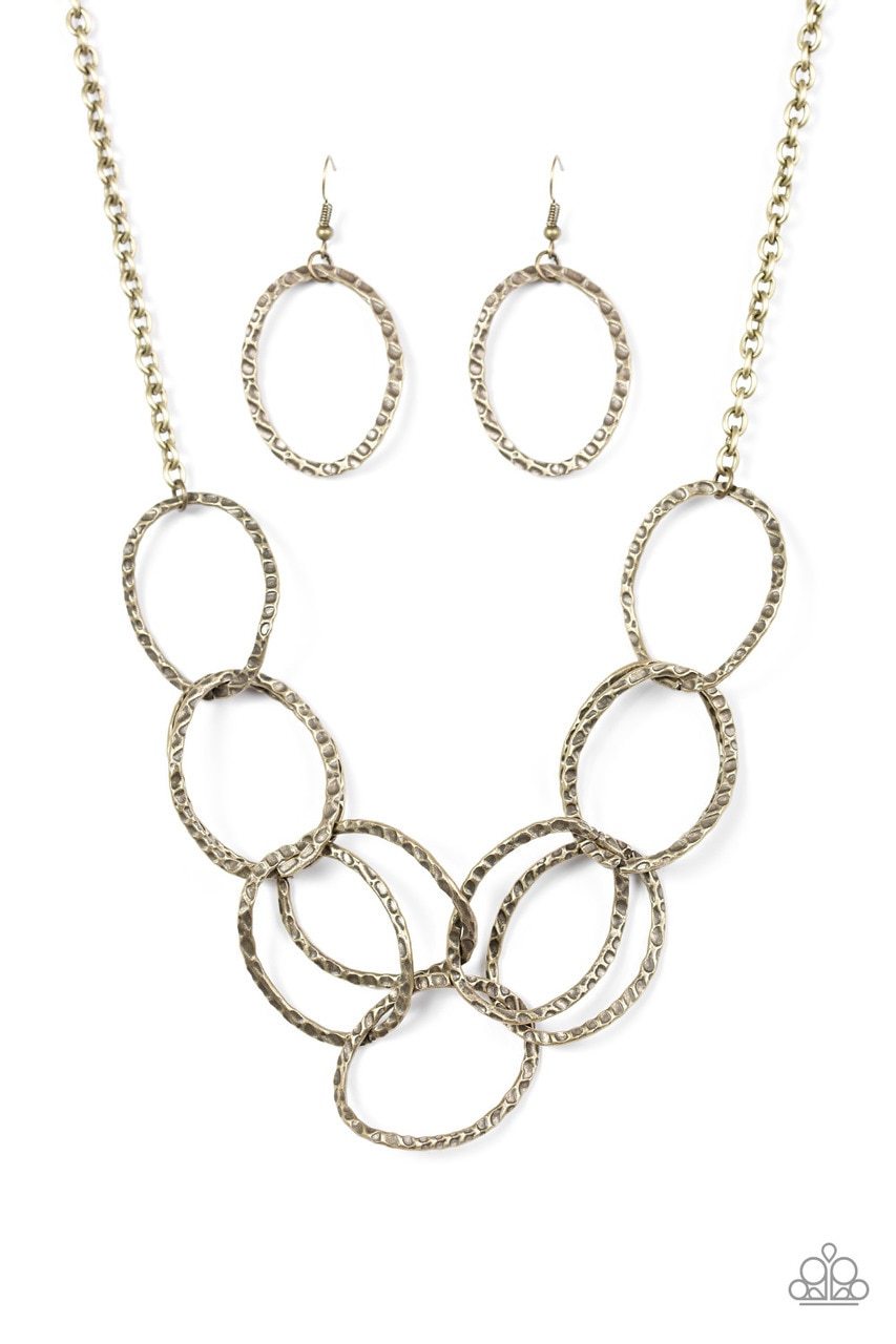 Introducing the Paparazzi Necklace - Circus Royale in Brass! Delicately hammered asymmetrical brass rings create a shimmering effect. This edgy piece features two layered rows that interlock below the collar. Complete with an adjustable clasp closure for the perfect fit. Sold as one single necklace with a pair of matching earrings included.