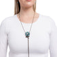 A marquise-cut turquoise stone flower with a white rhinestone-encrusted center, complete with brass studded leaves and a stem slides along dainty strands of glistening brass snake chain for a rustic, refined tassel. Additional marquise-cut turquoise stones dot the end of the chain in studded brass frames for an earthy finish. Features a bolo closure. As the stone elements in this piece are natural, some color variation is normal.