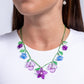 Infused along an invisible string, a collection of shimmery green seed beads coalesce below the neckline, sporadically interrupted with textured, translucent green leaves and multicolored flowers in varying dimensions and shades of Capri, Plum, and lavender. Besides the outermost Plum flowers, each flower features a dainty pearl centerpiece, with the centermost flower featuring an additional three-dimensional purple flower adding a playful touch to the whimsically vibrant design. Features an adjustable clasp closure.