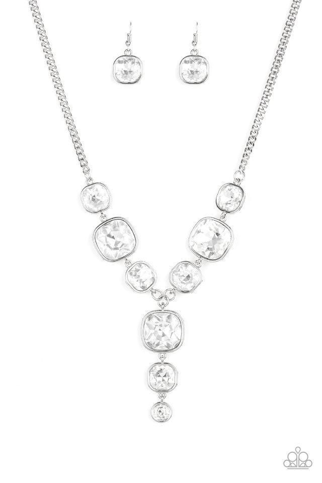 Enhance your look with the Paparazzi Necklace in Legendary Luster White. Featuring sleek silver frames, a collection of stunning white gems cascade from the thick silver chain, with additional gems creating a glamorous pendant. Complete with an adjustable clasp closure, this necklace comes with a pair of matching earrings. Elevate your style with this exquisite piece.