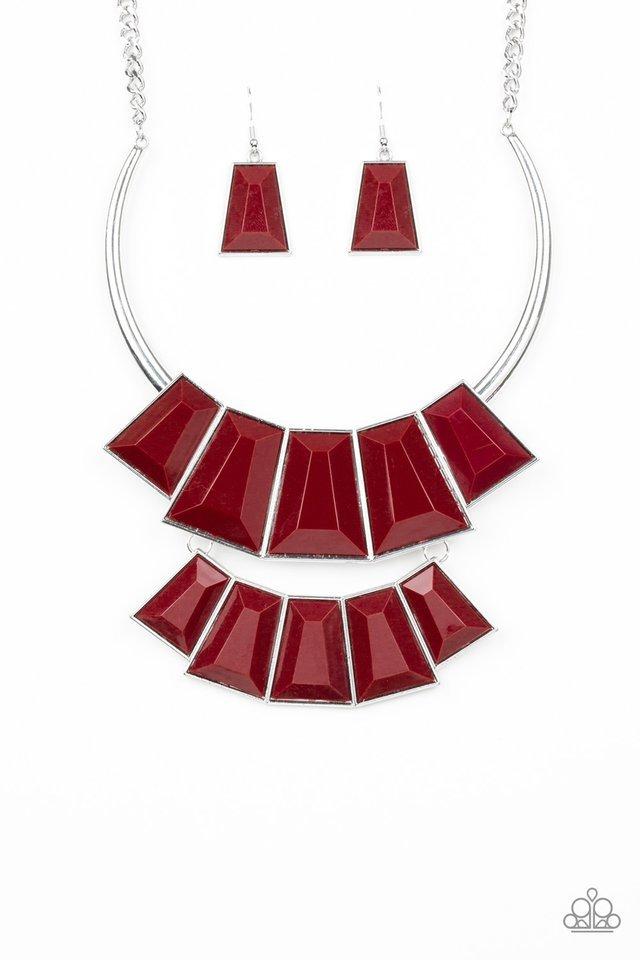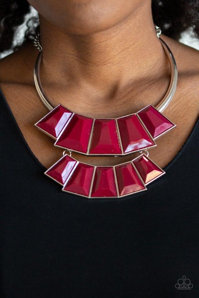 Unleash your fierce style with the Paparazzi Necklace ~ Lions, TIGRESS, and Bears in Red tinted in a deep shade of wine. Rows of faceted emerald-shaped beads create a colorful masterpiece, accented by a playful silver bar for added movement. This statement piece features an adjustable clasp closure and comes with matching earrings. Sold individually. Explore more necklaces for your collection!