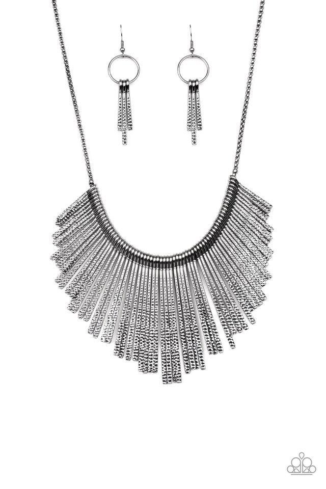 Elevate your look with textured gunmetal rods cascading from a gunmetal chain, creating a striking tapered fringe. Complete with an adjustable clasp closure, this statement piece is sold as one individual necklace, paired with matching earrings. Explore more Paparazzi collections including necklaces, bracelets, earrings, and rings to find your perfect accessories.