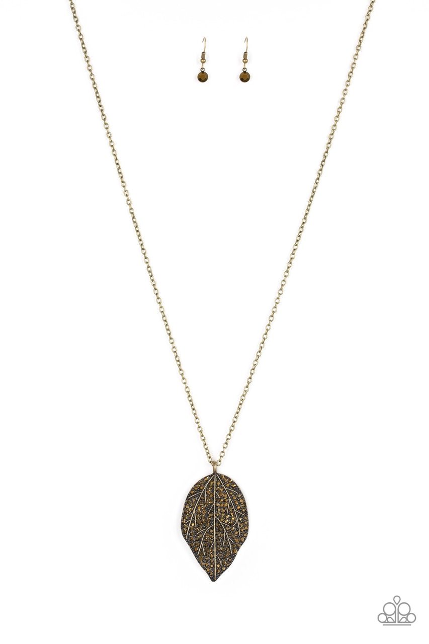 Paparazzi Necklace ~ Natural Re-LEAF - Brass is a stunning addition to your collection. Featuring lifelike patterns, an aurum rhinestone encrusted brass leaf swings from the bottom of a lengthened brass chain, creating an edgy pendant. Features an adjustable clasp closure. Sold as one individual necklace, it includes one pair of matching earrings. Elevate your style with this unique piece. Shop now for more Necklaces!