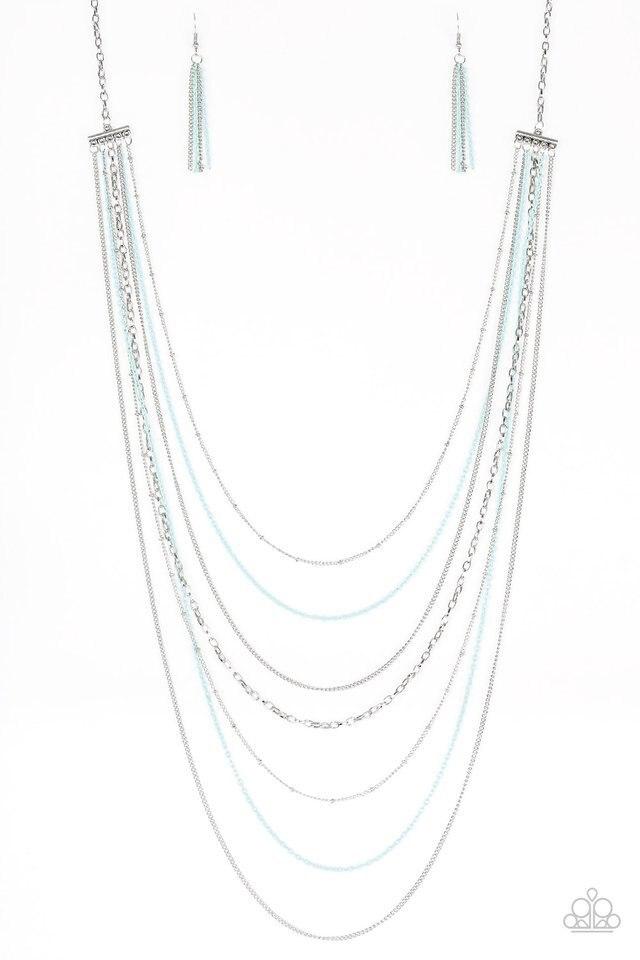 Experience the vibrant blue hues of the Paparazzi Necklace ~ Radical Rainbows. Mismatched silver chains interlace with delicate blue chains, offering a bold and industrial aesthetic. This statement piece features an adjustable clasp closure for comfort and style. Sold as one individual necklace, complete with a matching pair of earrings for a cohesive look. Elevate your ensemble with this captivating accessory from Paparazzi.