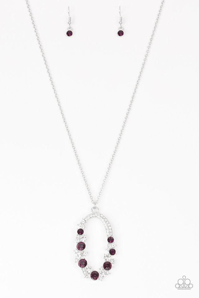 Paparazzi Necklace - Spotlight Social - Purple is a stunning accessory featuring glittery white and purple rhinestones on a shimmery silver hoop. The pendant swings elegantly from an elongated silver chain with an adjustable clasp closure. This stylish piece is sold as one individual necklace and includes a pair of matching earrings. Elevate your look with this glamorous set. Explore more Paparazzi jewelry here.