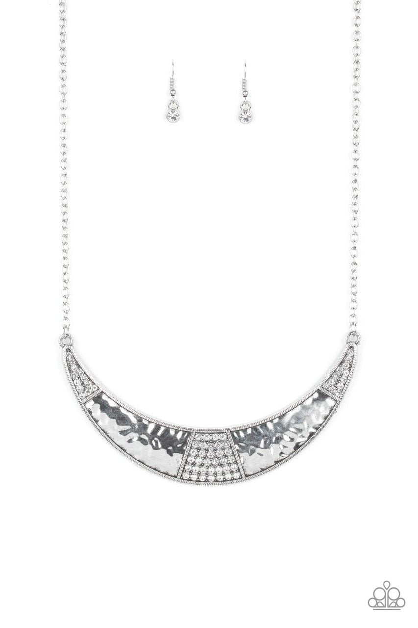 Description: Featuring a shimmery hammered finish, a glistening silver half-moon plate is encrusted in sections of glassy white rhinestones, creating a blinding statement piece below the collar. Features an adjustable clasp closure. Sold as one individual necklace. Includes one pair of matching earrings.