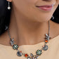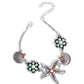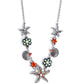 Featuring studded and crimped textures, a collection of coastal-inspired charms including pearl-dotted silver starfish, silver seashells, solitaire orange gems, and green iridescent-petaled pearly flowers pattern below the neckline from an abstract layered silver chain. The centermost oversized starfish is dotted with additional dainty light-colored topaz, yellow, and orange rhinestones for an opulent oceanic finish. Features an adjustable clasp closure. Due to its prismatic palette, color may vary.