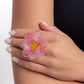 A captivating floral motif showcases translucent pink petals trimmed in gold, forming a three-dimensional bloom. A cluster of vibrant yellow beads sparkles at the center, adding a dramatic pop of color to the whimsical design. Features a stretchy band for a flexible fit.