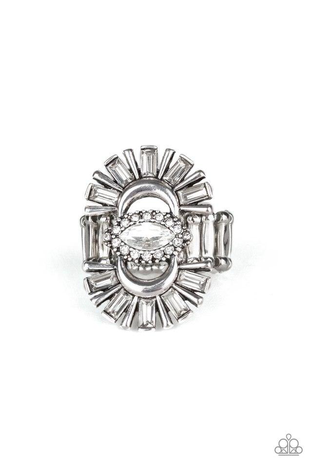Elevate your style with our Deco Diva ring, featuring a stunning collision of white emerald-cut rhinestones and antiqued silver frames. The white rhinestone encrusted center creates a dramatic centerpiece on your finger. This ring comes with a stretchy band for a perfect fit, making it a must-have accessory for any fashionista. Sold individually. Rings. Shop our ring collection for more trendy looks.