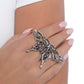 Featuring an antiqued silver finish, an oversized moth rests across the fingers. The wings stretch out in detailed filigree for a whimsical design. Features a stretchy band for a flexible fit.