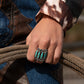 Featuring a series of elongated turquoise stones, a silver rectangular frame arcs across the finger in a symmetrical design. Each stone is encased in a textured silver frame, highlighted by dotted and studded details for added dimension. Features a stretchy band for a flexible fit. As the stone elements in this piece are natural, some color variation is normal.